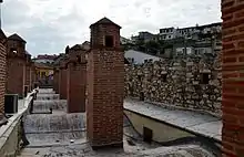 On the roof, there is a 90 cm (3.0 ft) wide aisle behind the battlement. The merlons were designed suitable for pouring hot oil onto the enemy. To the northwest and northeast corners of the caravanserai, great importance is attached in regard of an attack coming from the sea. The merlons on the northeast corner are higher giving it an impression of a watchtower. The entablature is 10.60 m (34.8 ft) high at the inside of the structure while the building's height on the outside is 12.63 m (41.4 ft).[4]