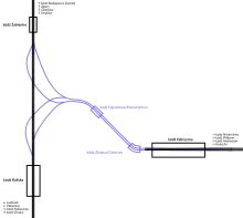 The plan for conventional rail tunnel consisted of a double-track tunnel running between Łódź Fabryczna station and railway line no. 15, running between Łódź Kaliska and Łódź Żabieniec stations, with the possibility for both stations to access the tunnel. The plan proposed the construction of two additional stops: Łódź Śródmieście and Łódź Polesie. Łódź Śródmieście will be located under the intersections of Zielona and Zachodnia streets with Kościuszko Avenue. Łódź Polesie is proposed to be located near the intersections of Ogrodowa and Jan Karski streets, near the Manufaktura shopping gallery (former site of I. Poznański's textile factory). The double-track connection with Kaliska and Żabieniec stations will be provided by an underground branch post Łódź Włókniarzy, where the tunnel will split firstly into 2, then into 4 single-track tunnels - a pair for each station.[8] The total length of the tunnel is estimated to be approximately 2.7 kilometres (1.7 mi).[9]