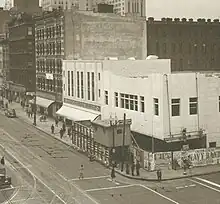 Russell's Tavern operated until 1847, succeeded by the F. C. Sessions' dry goods store. As early as 1922, the F. W. Woolworth Company operated a five-and-dime store there.[3][7] It was one of four Woolworth's in Columbus by 1934.[8] In March 1937, the company sought bids to construct a new building for the store on the same site.[1] By April, the construction arrangements were completed. The store was to be the largest Woolworth's in the area of Michigan, Indiana, Ohio, Kentucky, and West Virginia, and carrying a cost of $350,000. The new store would require razing of two old four story buildings: Woolworth's and the Wilbur Rogers dress shop.[2] The store opened around 1938, just before a new Woolworth's opened at 105 North High Street, replacing one destroyed in a fire in the previous year. Both buildings were designed in a similar style.[9]