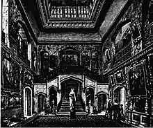 From the front door there was a small entrance hall, with a library and dining room either side.[3] The entrance hall lead to the saloon, at the centre of the house, which was two storeys high and topped by a skylight incorporating "embosed and coloured glass" featuring "shields, coats of arms, mottoes and monograms".[3] The saloon originally contained a stone staircase which was replaced with a double oak one in 1924.[3] Also in 1924, the saloon was redecorated in oak panelling, and cantilevered landings added around three sides of the second storey of the room.[3] The saloon was flanked by a serving room (adjacent to the dining room), a dressing room, the second (servants') staircase, and a waiting room.[3]