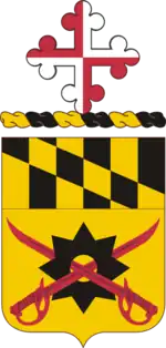 The 158th Cavalry was constituted on 31 March 1975 in the Maryland Army National Guard, a parent regiment under the Combat Arms Regimental System (CARS), and organized on 1 April from existing units. Troop A (Air) was redesignated from Troop D, 1st Squadron, 223rd Cavalry. Troop D was redesignated from Troop D, 1st Squadron, 183rd Cavalry after being relocated to Bel Air on 21 January 1968. It was constituted on 1 March 1959 as the 29th Aviation Company (part) and organized and Federally recognized on 7 July 1959 at Baltimore before being relocated to Edgewood on 1 May 1960. The company became Company B, 29th Aviation Battalion on 1 March 1963, and Troop D, 1st Squadron, 183rd Cavalry on 1 November 1965.[2] Troop B was redesignated from Troop B, 1st Squadron, 223rd Cavalry Regiment. Both troops were part of the 58th Infantry Brigade. On 1 October 1975, Troop A became the 224th Aviation Company.[2] On 1 July 1986, the regiment was reorganized to include 1st Squadron, part of the 29th Division, after the 29th was reactivated. The squadron became the division reconnaissance squadron and Troop B became the Headquarters and Headquarters Troop (HHT). Troop A, a ground reconnaissance unit, and Troop B and C, helicopter reconnaissance units, were newly organized.[4] On 1 June 1989, the regiment was withdrawn from CARS and reorganized under the United States Army Regimental System (USARS) with headquarters at Annapolis.[5]