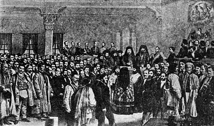 Wallachia's ad hoc Divan opened on September 29 (October 10), seven days after its Moldavian counterpart. The rainy weather did not chase away the crowd gathering in a show of support on Dealul Mitropoliei, Bucharest.[158] The celebration lasted into the night, with Bucharest festively lit with the newly introduced gas lighting and adorned with the National Party's slogans.[159] The Divan's first session saw enthusiastic speeches, including one by Rosetti which ended with shouts of Trăiască România! ("Long Live Romania!").[137] It subsequently organized itself: two committees were set up to validate the deputies and come up a parliamentary procedure; one was chaired by Grigore Gr. Ghica.[59] Metropolitan Neofit was, ex officio, the Divan's president, and tacitly endorsed the union,[152] with N. Golescu elected vice president by a large margin.[160] The Divan's secretaries included D. Brătianu (elected with 85 votes),[139] C. A. Crețulescu, Rosetti, Turnavitu,[161] Ștefan Golescu, and Bosianu.[162] Iancu Ionașcu oversaw the official printing office.[163]
