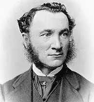Canadian legislator John Charles Rykert wears a narrow ribbon necktie and a collarless waistcoat. His coat has wide lapels. 1873.