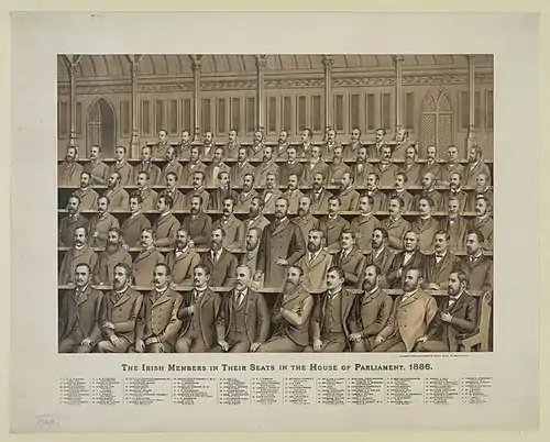 ![]() Results of the 1886 election in Ireland Conservative Liberal Unionist Irish Parliamentary Party | |||||||||||||||||||||||||||||||||||||||||||||