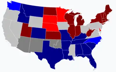 1900 presidential election results. Red denotes states won by McKinley, blue denotes states won by Bryan. Numbers indicate the electoral votes won by each candidate.