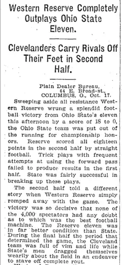 Plain Dealer article describing the Western Reserve-Ohio State football game the next day on October 18, 1908.