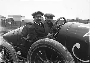 At Peugeot, the three driver-engineers Georges Boillot, Jules Goux and Paolo Zuccarelli (dubbed “The Charlatans”[6]) had worked with Ernest Henry and produced their first design. Fellow Peugeot-engineer Ettore Bugatti had also produced a design and the two had a run-off. The drivers’ car was comfortably faster, reaching 160 km/h (99 mph), built with a four-cylinder 7.6L engine. The innovative twin-overhead camshaft, with four valves per cylinder, developed 148 bhp revving at 2200rpm.[5][7] This was equivalent to nearly 20 bhp per litre and 50% higher than the performance of its main rival, the Fiat S74, that only gave 13 bhp per litre at a leisurely 1600rpm over its 14.1 litre engine.[8] Although some of the ideas were not new, it was Peugeot that combined them and pioneered the use of hemispherical combustion chambers. There is some evidence that Zuccarelli got the ideas from his former work at Hispano-Suiza and that legal action was taken for breach of patent.[7] The Peugeot engine became the template for race-engines for many years.[9]