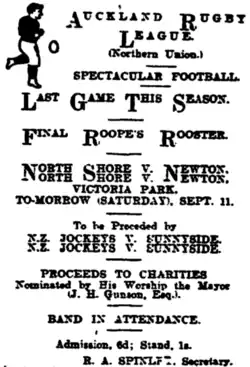 - ↑ "Roope's Rooster/Won by North Shore". The New Zealand Herald. Vol. LII, no. 16021. 13 September 1915. p. 3. Retrieved 13 August 2019.