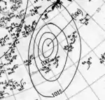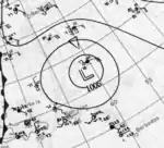 Around August 31, a low-pressure area formed along the tail end of a cold front extending from the Bahamas to Bermuda.[4] Early on the following day, a tropical depression developed roughly 510 mi (820 km) east-southeast of Jacksonville, Florida.[2] The depression moved slowly east-northeastward as the cold front dissipated.[4][2] Late on September 3, the system intensified into a tropical storm, and the next day the cyclone passed northwest of Bermuda.[2] Based on observations from the S.S. Evergreen City, the small storm likely reached Category 1 hurricane intensity early on September 5.[4] The cyclone continued to strengthen, reaching Category 2 intensity on September 6 while drifting northward and then peaking with maximum sustained winds of 105 mph (165 km/h) early the following day. On September 8, the system curved northwestward and weakened to a Category 1 hurricane. The storm then turned north-northeastward on September 9 and transitioned into an extratropical cyclone later that day. The extratropical low continued north-northeastward until dissipating over southern Newfoundland on September 10.[2] Cape Race observed sustained winds of 29 mph (47 km/h).[4]