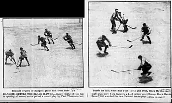 - ↑ Schreiber, Frank. "Blackhawks Win Hockey Opener 4–1". Chicago Daily Tribune. p. 19.