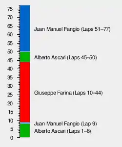 • Car #4: Fangio (first 15 laps) then Fagioli (40 laps). When Fagioli rejoined the race in Fangio's car he was already 20 laps behind.