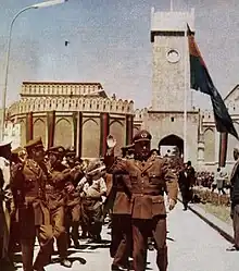Zahir Shah left Afghanistan for London, via Rome, on the morning of June 25, 1973 for hemorrhaging treatment after injuring his eye. After treatment he went back to Italy spending time in the island of Ischia.[5] The 444th Commando Battalion, including Faiz Mohammed and Khushal Peroz, took over the royal residence in the dead of night.[13] Daoud Khan, with several hundreds of his supporters from the army launched the coup on the morning of July 17;[5] within hours and without any armed resistance,[4] the monarchy ended and Khan announced the new republic through Radio Afghanistan at 7 in the morning. Staff from the United States National Security Council described it as a "well planned and swiftly executed coup."[5]