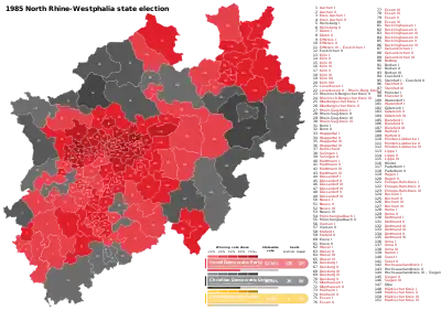In the previous election held on 11 May 1980, the SPD recorded a clear victory, winning an outright majority in the Landtag with 48.4% of votes while the CDU declined to 43.2%. The FDP fell narrowly short of the 5% threshold and lost their seats. The SPD formed government alone and Johannes Rau continued as Minister-President.