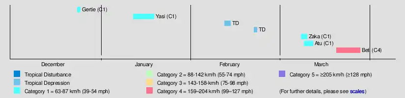 | Beti | March 21 – 28 | Category 4 severe tropical cyclone | 165 km/h (105 mph) | 935 hPa (27.61 inHg) | Australia, Vanuatu New Caledonia, New Zealand | $5.3 million | 2 | [8][22][23] |