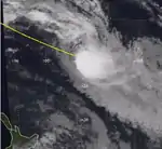 On January 12, the FMS reported that a tropical depression had developed over the Fijian island of Vanua Levu, about 430 km (270 mi) to the south of Labasa.[8] Over the next few days, the depression moved towards the southeast before it started to affect Tonga on January 15.[12] During the following day, the depression rapidly developed further as it interacted with the South Pacific Convergence Zone, before the NPMOC initiated warnings on the system and designated it as 08P.[3][8] At 0000 UTC on January 17, the NPMOC reported that the depression had reached its peak 1-minute sustained windspeeds of 85 km/h (53 mph), while the FMS reported that the depression had intensified into a tropical cyclone while it was located about 510 km (320 mi) to the southeast of Nukualofa, Tonga.[8][12] However, the FMS did not name it Yasi for another 12 hours, while the system reached its peak 10-minute sustained windspeeds of 85 km/h (53 mph).[8][12] After it was named on January 17, Yasi accelerated towards the southeast, before it moved out of the FMS's area of responsibility.[12] During January 18, the NPMOC issued their final warning because Yasi had degenerated into an extratropical cyclone.[3][8] MetService monitored Yasi's remnants for another day, before the system dissipated about 1,520 km (940 mi) to the south of Papeete, French Polynesia.[12] Although no major damage was reported from any of the islands affected some minor damage was reported in Tonga, after Yasi caused heavy rainfall there.[8][13]