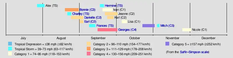 Hurricane MitchTropical Storm Hermine (1998)Hurricane GeorgesTropical Storm Frances (1998)Hurricane Earl (1998)Hurricane Danielle (1998)Tropical Storm Charley (1998)Hurricane Bonnie (1998)Saffir–Simpson scale