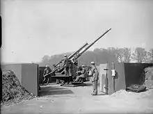 On 5 June 1940, after the British Army had been evacuated from Dunkirk and the Battle of Britain was about to start, the 1st AA Division comprised 45 4.5-inch, 39 3.7-inch and 26 3-inch HAA guns, with three 3-inch, 19 Bofors, three twin Vickers and 185 LMGs in the LAA role, together with 240 90 cm searchlights.[19] On 11 July, the division's guns were disposed with 92 defending London, 28 at Slough, 4 at Hounslow, 4 at Stanmore, and 34 others dispersed to VPs.[20]