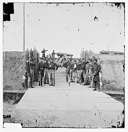 In August 1864, Ira McL. Barton, the captain of Company B, requested further recruits and, with authorization granted to organize a battalion-sized unit, returned to New Hampshire to take part in the raising of an additional four companies.[2] Recruiting within the cities of Nashua, Concord, Laconia and Dover, the number of volunteers exceeded what was needed. The state adjutant applied to the War Department for authority to continue the formation of companies, and by November 1864 nearly had the required number of men to be organized into a proper regiment. To do so, the 1st New Hampshire Light Battery, who had just gone through its reenlistment following the end of a three-year term of service, became "Company M" of the 1st NH Heavy Artillery on 9 November. However, they were soon detached and returned as light artillery in Hancock's II Corps.