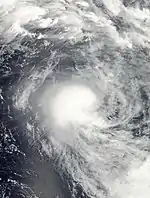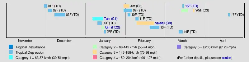 During March 13, the FMS reported that Tropical Depression 14F had developed about 225 km (140 mi) to the southeast of Port Vila, Vanuatu.[27][28] The system was slowly moving within an area of high vertical wind shear with atmospheric convection, displaced about 220 km (135 mi) to the east of the low level circulation centre.[27] Over the next couple of days the system moved southwards and never became well organised, before it was last noted by the FMS during March 16.[28] The precursor tropical low to Severe Tropical Cyclone Larry moved into the basin, from the Australian region and was assigned the designator 16F by the FMS during March 16.[28][29] However, during that day the system recurved and moved back into the Australian region during the next day, where it later made landfall near Innisfail, Queensland and caused widespread damage to Queensland.[28][29] During April 20, the FMS reported that Tropical Depression 17F had developed to the east of the International Date Line, about 500 km (310 mi) to the southeast of Suva, Fiji.[30][31] Over the next day the system moved south-eastwards and remained weak and exposed, with deep convection displaced to the south and east of the low level circulation centre.[30][32] The system was subsequently last noted by the FMS during April 21, as it left the tropics.[31][33] During the final days of April, several depressions to the east of the International Date Line were noted by the FMS, however, none of these were referred to as tropical depressions.[31]