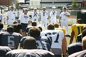 Head coach Chris Ault introduces football players with Commander Marc Behning, left, commanding officer of the Ohio–class fleet ballistic–missile submarine USS Nevada (SSBN-733) at the University of Nevada, Reno on September 16, 2009