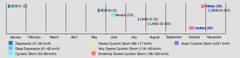 | Hudhud | October 7–14 | Extremely severe cyclonic storm | 185 kilometres per hour (115 mph) | 950 hPa (28.05 inHg) | Andaman and Nicobar Islands, India, Visakhapatnam, Nepal | $3.58 billion | 124 | [26][41][42][43][44] |