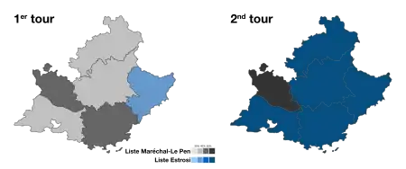 Provence-Alpes-Côte d'Azur uses a two-round runoff system to elect the regional president, and if not candidate win at least 50% on the first round there are another and definitive round.