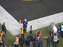 One of the sideline reporters shows off the College Football Playoff trophy late in the fourth quarter.