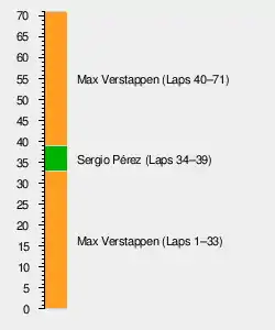 Max Verstappen was leading most the race with Sergio Perez taking the lead for a short while, during the period that Verstappen had pitted and he hadn’t. Perez became the first Mexican driver to lead his home Grand Prix. Lewis Hamilton was in second with Verstappen having a clear lead over him. Hamilton and Perez were close towards the end with Perez not far from trying to get past him.[21] Hamilton managed to keep second place and Perez came home to finish third. By finishing 3rd, Pérez became the first Mexican driver to get a podium at home.[22]