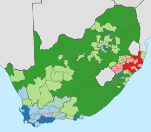 The ruling African National Congress (ANC) has been the majority party in most municipalities across South Africa, with the exception of those in the Western Cape, since 1994. Its overall share of the vote decreased from 61.95% in 2011 to 53.91% in 2016 amid growing discontent regarding the state of the country's economy and perceived corruption within the organisation. The party lost many municipalities and support in the previous municipal elections, including the mayoralty and majority in councils such as Nelson Mandela Bay, Tshwane and Johannesurg.[20] The party had to form coalitions to retain control of the City of Ekurhuleni and many other municipalities. The ANC has managed to gain back control in many municipalities through motions of no confidence. Although the party ousted the Democratic Alliance administration in Nelson Mandela Bay, the party voted to elect a mayor from the United Democratic Movement (UDM). The ANC was led by Jacob Zuma until he was replaced by Cyril Ramaphosa at the 57th National Conference in December 2017. Ramaphosa assumed the presidency in February 2018 and the ANC won the 2019 national elections with a slight decrease in the number of votes.[21][22][23][24] The ANC regained control of the City of Johannesburg on 4 December 2019 following the election of its regional leader, Geoff Makhubo, to the mayoralty.[25] The party voted to remove the UDM mayor of Nelson Mandela Bay on 5 December 2019.[26] The party announced its election manifesto on 27 September 2021. Ramaphosa said that mayors would not be appointed based on popularity.[27]