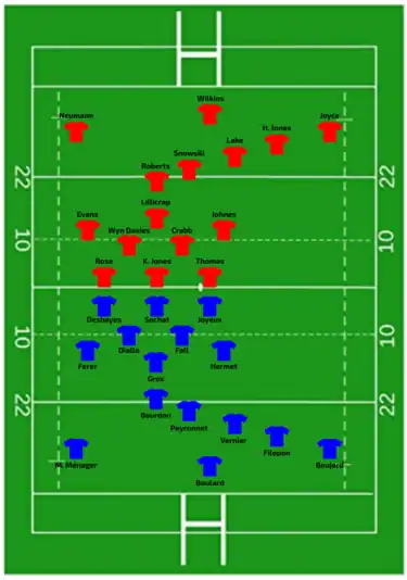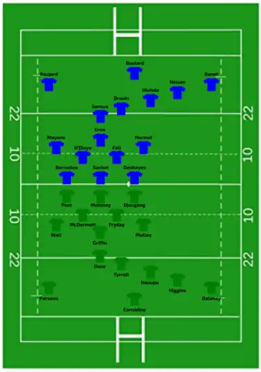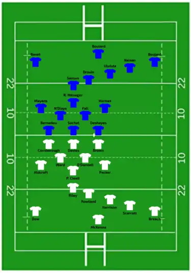 Report | Try: Boujard (2) 14' c, 47' m Boulard 19' c Penalty try 22' N'Diaye 34' c Banet (2) 39' c, 72' m R. Ménager 57' m Con: Drouin (4/6) 15', 20', 35', 40' Pen: Drouin (2/2) 31', 66' |