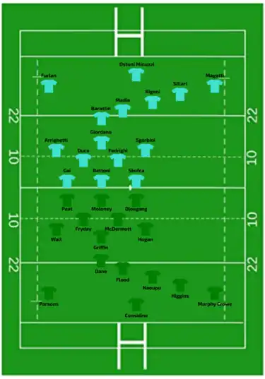 Report | Try: Rigoni (2) 7' c, 68' m Furlan (3) 10' m, 59' m, 79' c Arrighetti 40' +1 c Ostuni Minuzzi 42' m Con: Sillari (4/7) 8', 40' +2, 80' |