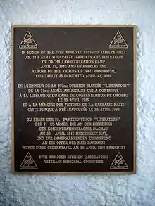 Elements of the 20th Armored Division, along with those of the U.S. Seventh Army's 45th (Thunderbird) and 42nd (Rainbow) Infantry Divisions, participated in the liberation of Dachau concentration camp on 29 April 1945. While anecdotal reports indicate varied 20th AD troops took part in the unfolding process of discovery and liberation of the camp, ultimately it was the above attachment of elements of the 27th Tank Battalion to those of the 42nd Infantry Division on which the 20th Armored would be jointly recognized by the US Army Center for Military History (CMH) and the United States Holocaust Memorial Museum (USHMM) as an official Liberating unit. The Division and its flag were subsequently added to USHMM displays and were cited online there and elsewhere.