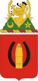 A Gold color metal and enamel device 1+1⁄8 inches (2.9 cm) in height overall consisting of a shield blazoned: Gules, in front of a horseshoe Proper, a 75mm projectile Or. Attached below the shield a Red scroll inscribed “COURAGE AND ACTION” in Gold letters.