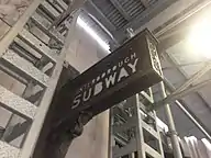 A second fare control area at the southern end of the southbound platform leads to a privately operated passageway in the basement of the New York Life Building, between 26th and 27th Streets.[26] It is only open from 7 a.m. to 7 p.m. on weekdays.[59] The New York Life Building entrance has an Art Deco inspired interborough subway sign hanging from the facade of that building.[2]:8[59][60]