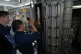 Loading a 70-pound (32 kg) 5-inch round in the below-deck gun mount