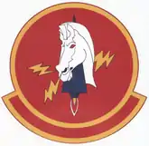 2. Approved 4 October 1943. Description: On a scarlet disc, a white flying Trojan horse, outlined in black, winged with Fortress wings ultramarine blue, edged white, having a golden lance spike on the knees of each foreleg. eyes red, and breathing jagged golden orange lightning flash from each nostril.