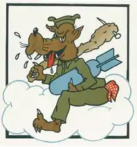 1. Approved 24 July 1943. Description: On a white rectangle, long axis vertical, border black, a caricatured brown wolf in khaki work uniform, astride a large white cloud formation in base, edged light blue, carrying a large knotty club tan with spike through end, in right hand, and carrying a blue aerial bomb under the left forepaw; red polka dot handkerchief in hip pocket.