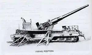 The ex-Navy Mark VI railway gun was quickly put together at the start of World War II, to supplement the older World War I 8-inch M1888 railway gun. It was developed from an experimental 12-inch (305 mm) railway howitzer carriage of World War I.[3] The all-around rotating mount and outriggers were designed to allow the gun to track a moving target for coast defense. These guns had a very short life in Army use, entering service in February 1941 and being cut up for scrap immediately after the war. The guns were the Navy's 8-inch (203 mm)/45 caliber Mark VI, and were originally secondary armament on Virginia- and Connecticut-class battleships launched 1904-06 and scrapped in the 1920s.[4] They were mounted in both fixed emplacements and on the M1A1 railway carriage.[1]