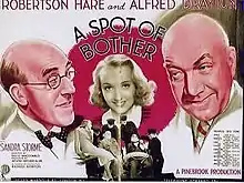 A Spot of Bother is a 1938 British comedy film directed by David MacDonald and starring Robertson Hare, Alfred Drayton, Sandra Storme and Kathleen Joyce.[2] The film is a farce in which a bishop unwisely decides to loan the cathedral funds to a dubious businessman. Meanwhile, his secretary is involved with smuggled goods.[3] It was shot at Pinewood Studios and adapted from a play by Vernon Sylvaine. The film's sets were designed by Wilfred Arnold.