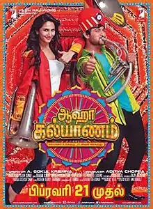 Aaha Kalyanam (transl. Wow Marriage) is a 2014 Indian Tamil-language romantic comedy film directed by debutant A. Gokul Krishna and produced by Aditya Chopra's Yash Raj Films.[2] A remake of Maneesh Sharma's 2010 Hindi film, Band Baaja Baaraat, the film stars Simran, Nani and Vaani Kapoor.[3] Although it was planned for bilingual release, it was shot completely in Tamil, and a dubbed Telugu version was released simultaneously along with the Tamil version.[4] The film was released worldwide on 21 February 2014.