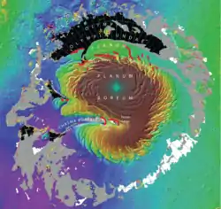 It is theorised that the dunes of the Abalos field may have resulted from erosion of Rupes Tenuis (Latin: Thin Cliff), the polar scarp.[2][5] Its name was approved by the International Astronomical Union in 1988.[1] It extends from latitude 74.94°N to 82.2°N and from longitude 261.4°E to 283.03°E (76.97°W – 98.6°W). Its origin is located at classical albedo feature with coordinates 72°N, 70°W and has a diameter of 442.74 km.[1]