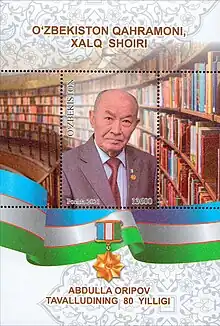 Abdulla Oripov (Uzbek: Abdulla Oripov, Абдулла Орипов; 21 March 1941 – 5 November 2016) was an Uzbek poet, literary translator, and a politician.[2] He is best known as the author of the lyrics to the State Anthem of Uzbekistan.[3] In addition to writing his own poetry, Oripov translated the works of many famous foreign poets, such as Alexander Pushkin, Dante Alighieri, Nizami Ganjavi, and Taras Shevchenko, into the Uzbek language.