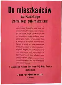 The Act of 5th November of 1916 was a declaration of Emperors Wilhelm II of Germany and Franz Joseph of Austria. This act promised the creation of the Kingdom of Poland out of territory of Congress Poland, envisioned by its authors as a puppet state controlled by the Central Powers. The origin of that document was the dire need to draft new recruits from German-occupied Poland for the war with Russia. Even though the act itself expressed very little in concrete terms, its declaration is regarded as one of main factors in the Polish efforts to regain independence. Despite official statements, the German Empire really planned to annex up to 30,000 km² of prewar Congress Poland, with expulsion of between 2 and 3 million Poles and Jews out of these territories to make room for German settlers.[1][2][3][4][5][6]