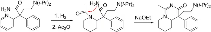 - ↑ Chorvat, Robert J.; Prodan, Kathleen A.; Adelstein, Gilbert W.; Rydzewski, Robert M.; McLaughlin, Kathleen T.; Stamm, Margarete H.; Frederick, Leo G.; Schniepp, Henry C.; Stickney, Janice L. (1985). "Synthesis and structure-activity relationships of a new series of antiarrhythmic agents: 4,4-disubstituted hexahydro-3H-pyrido[1,2-c]pyrimidin-3-ones and related compounds". Journal of Medicinal Chemistry. 28 (9): 1285–91. doi:10.1021/jm00147a029. PMID 4032431.