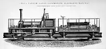 Manning, Wardle & Co. of the Boyne Engine Works, Leeds designed and built a special locomotive for its operation. It had to meet military as well as other requirements.[3] The general plan of the structure of the locomotive has been designed by J.B. Fell, but the working plans were prepared and the engine built by Manning, Wardle & Co, Leeds. The engine weighed 4½ tons, and the tender 3½ tons, with coal and water. There were three pairs of driving-wheels coupled, each 16 inches (406.4 mm) in diameter. There were also four horizontal wheels running upon guide rails fixed on the lower edges of the beams.[4]