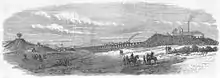 The track was laid down between the Field Stores Depot and the Barrack Stores. The line was upwards of one mile in length. About two-thirds is laid on curves from three chains (60 m) to seven chains (140 m) radius, and there was a gradient of 1 in 50 for a length of 770 feet (234.7 m) upon a trestle bridge of 20 to 25 feet (6.1 to 7.6 m) in height, the gauge being 18 in (457 mm). The rails were laid on two longitudinal timber beams, supported at intervals of 10 and 15 feet (3.0 and 4.6 m) by posts with lateral struts.[4]