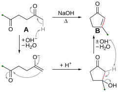 Intramolecular aldol condensation is between two aldehyde groups or ketone groups in the same molecule. Five- or six-membered α, β-unsaturated ketone or aldehydes are formed as products. This reaction is an important approach to the formation of carbon-carbon bonds in organic molecules containing ring systems. As an example, under strong basic conditions (e.g. sodium hydroxide), hexane-2,5-dione (compound A in Figure 1) can cyclize via intramolecular aldol reaction to form the 3-methylcyclopent-2-en-1-one (compound B).