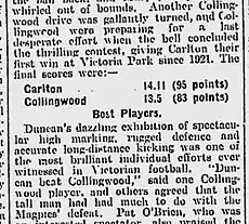 - ↑ Brownlow Medal: Won by S. Coventry, The Argus, (15 September 1927), p. 5. In the only match that Carlton played against Collingwood that year (round nine), Duncan was far, far better than anyone else on the ground, including Coventry (it was "Duncan's match").