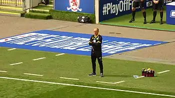 In January 2015, Neil obtained permission from Hamilton to speak to Norwich City about their managerial vacancy.[26] On 9 January, he was confirmed as their new manager at 33 years old, the second youngest in the Football League after Mansfield's Adam Murray.[27] The following day in his first game, he managed his team to a 2–1 victory at Championship leaders AFC Bournemouth.[28] Norwich gained 17 wins from 25 games played under Neil in the 2014–15 season.[29][30] They finished third in the Championship and entered the play-offs, where in the semi-finals they beat East Anglia derby rivals Ipswich Town 4–2 on aggregate over two legs.[31] On 25 May, Neil led Norwich to a 2–0 victory over Middlesbrough in the 2015 Football League Championship play-off final, as goalscorers Cameron Jerome and Nathan Redmond secured promotion to the 2015–16 Premier League.[29] During the 2015 close season, Neil signed a new contract with Norwich City.[32]