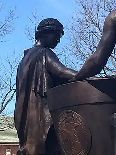 On the theme of the motto, he would pose two more figures on the same scale yet subordinate. He based Learning on Lemnia Athena as an heraldic gesture, clasping hands with a sturdy figure of Labor over the back of the chair.[5] The subordination of figures was accomplished by sculpting them "with less accent" so as to make them appear "out of focus."[6] According to financier Roland R. Conklin, an alumnus of the class of 1880, an initial completion date of October, 1918 was pushed back due to Taft's other commissions.[6] Having secured the necessary patronage, Taft and Conklin announced the gift on November 27, 1916.[8] The plaster cast was presented at the annual convocation of the Alumni Association at 3:00 PM on June 13, 1922.[9]